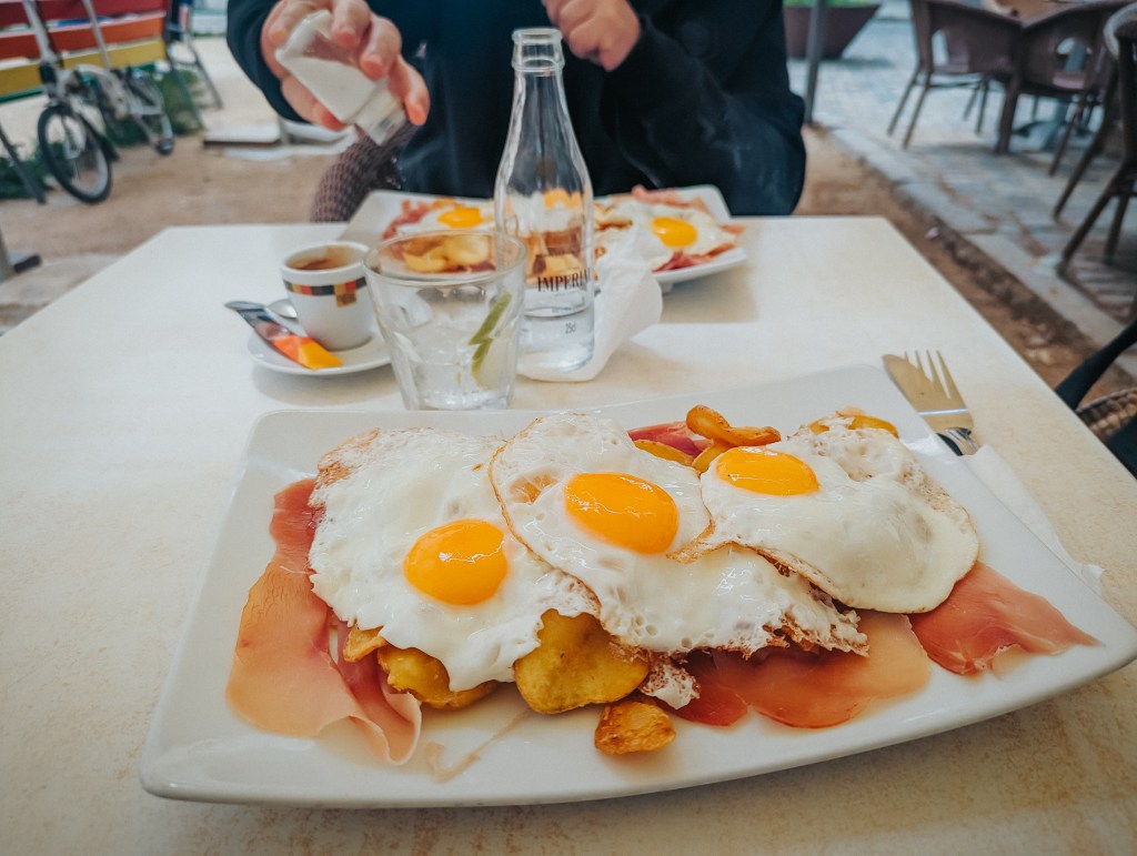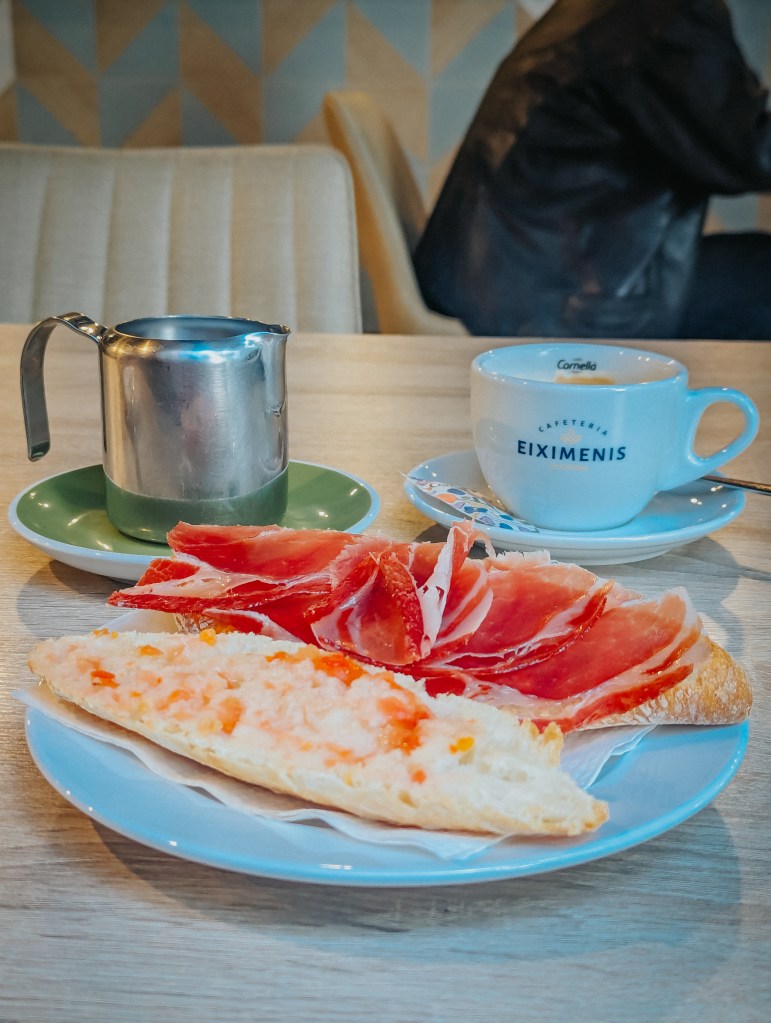 The next morning, we decided not to rush. After a late start, we had a sandwich and coffee at Eiximenis coffee shop. The bread spread with tomatoes instead of butter was a delightful alternative for those who are lactose intolerant and tasted delicious. Recharged, we set out to explore the city on foot, as everything we wanted to see was within walking distance.