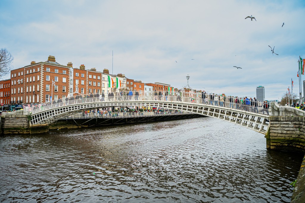 When our ears started ringing from the music inside Temple Bar, we decided a bit of a stroll was in order. We crossed the famous Ha’penny Bridge, originally built in 1816. This pedestrian-only bridge is an architectural gem, with its white cast-iron arch gracefully spanning the River Liffey. It got its name from the halfpenny toll once charged to cross it. My husband joked that the city should bring back the halfpenny toll to fund free pints of Guinness for tourists.