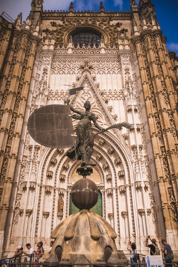 We then climbed La Giralda, the cathedral’s iconic bell tower. No steps, just 36 ramps, circling gently upward until the city unfolds beneath you. It’s a surprisingly easy walk, and the view from the top, terracotta roofs, church domes, and the entire historic centre lit by the afternoon sun, is worth every turn.