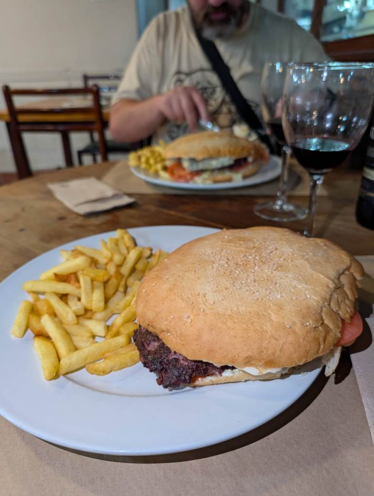 Knowing we wouldn’t have time to explore Málaga the next morning, we immediately set out for a late-night wander. Two doors down from the hotel, the universe gave us our first surprise: ‘El Rancho’. In this place, you can eat the largest burger ever. Honestly, the burger was the size of his hand, maybe bigger. Naturally, we paired it with a full bottle of red wine because when in Spain… well, when in Spain, you don’t drink water. Fueled by Rioja confidence, we drifted through the glowing streets of Málaga.