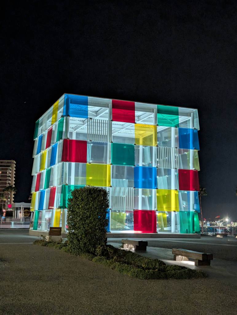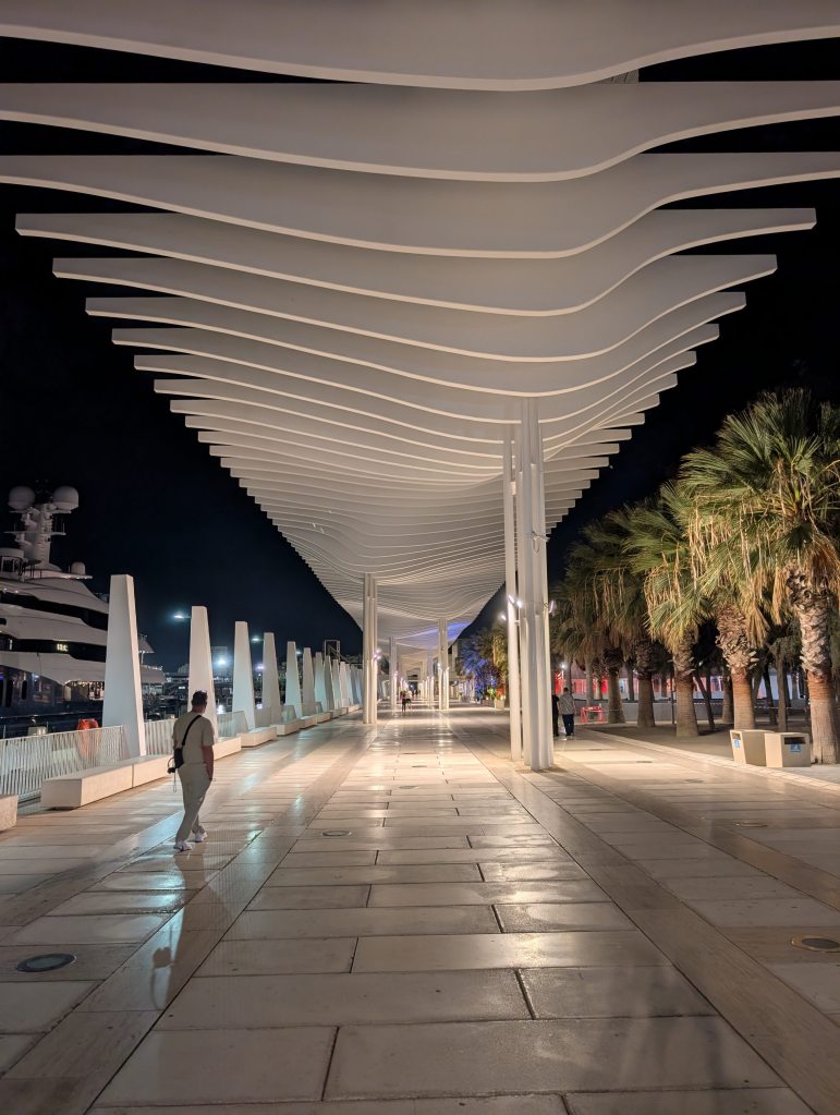 The Centre Pompidou Málaga lit up the port like a giant rainbow cube. We walked along the Palmeral de las Sorpresas, its palm trees swaying gently in the warm night air. Even at this late hour, the city felt alive, couples strolling, families finishing dinner, children insisting that sleep is optional.